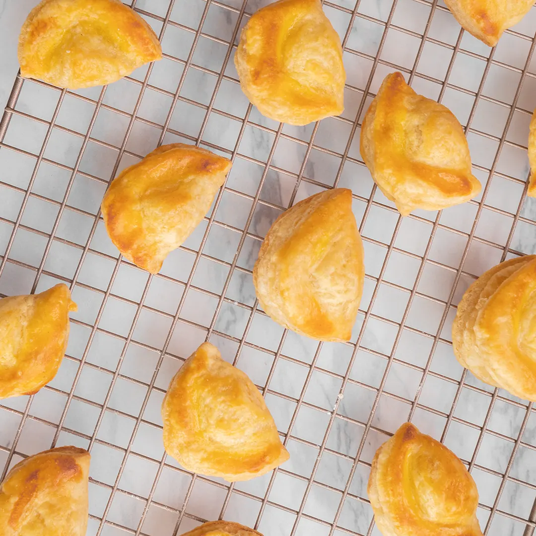 Deliciosas empanaditas crujientes, rellenas con queso suave. ¡Un bocado irresistible para cualquier celebración! No incluye salsas ni complementos.